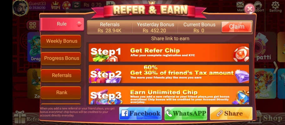 Referral Program: Invite friends to join the platform using your referral link and earn bonuses when they sign up and play.