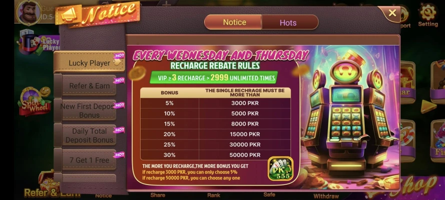 - Referral Program: Invite friends to join PK 555 and earn commissions on their deposits and gameplay.